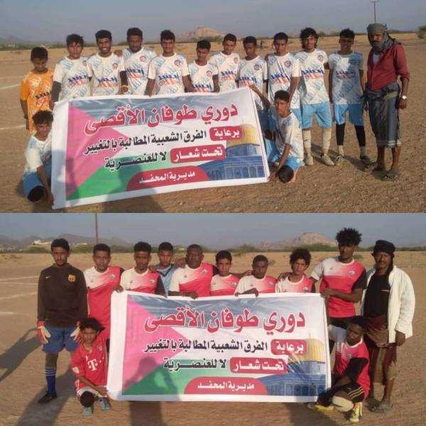 تتواصل مباريات دوري طوفان ألاقصى الذي يقام برعاية الفرق الشعبية المطالبة بالتغيير على ملعب الحاق الرياضي ولحساب المجموعة الثانية التي جمعت فريق شباب الاهلي وفريق النجوم الذي حسم اللقاء بهدفين نظيفين !