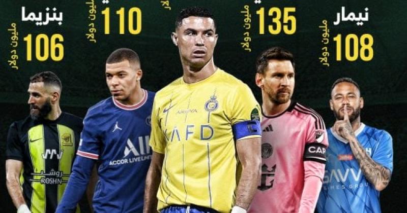 وتواجد البرازيلي نيمار دا سيلفا في المركز الرابع بالقائمة بواقع 108 مليون دولار جمع راتب قدره 80 مليون دولار، و28 حقوق رعاية، يليه كريم بنزيما في المركز الخامس بين لاعبى كرة القدم بواقع 106 مليون دولار.