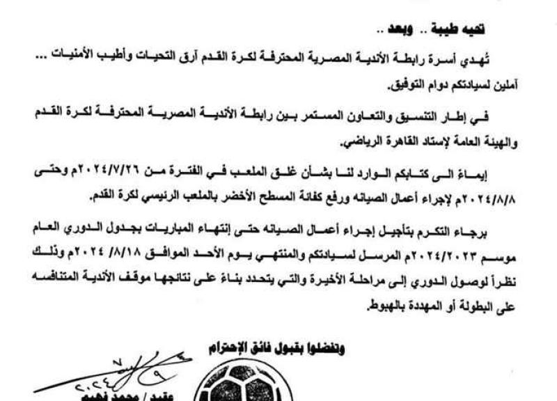 يأتي الخطاب في ظل قرار الهيئة بإغلاق الملعب لأعمال الصيانة من 26 يوليو حتى 8 أغسطس، مما قد يؤثر على جدول الدوري الممتاز لموسم 2023-2024.